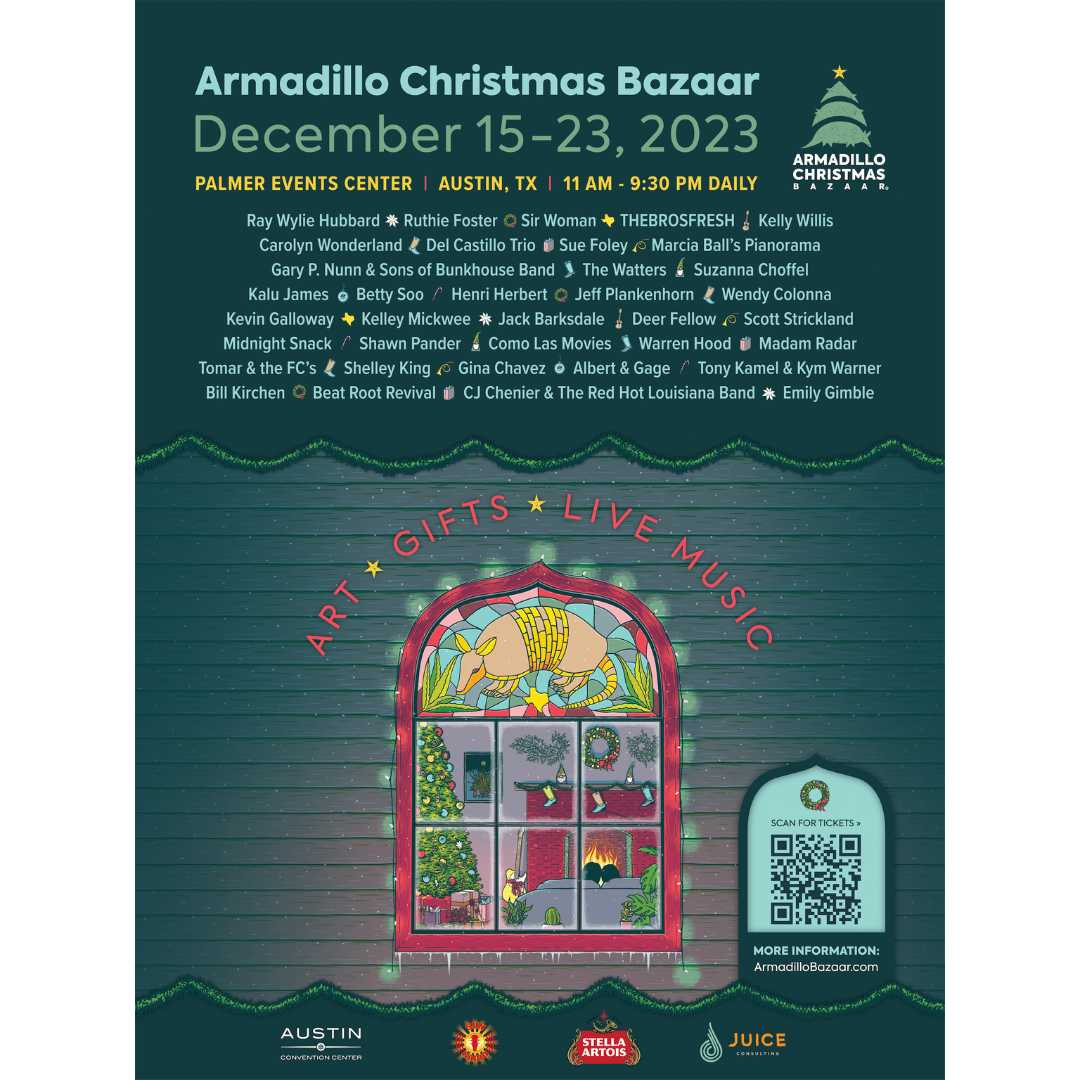 Beloved for its unique blend of fine art, distinctive gifts, and live music, the Armadillo Christmas Bazaar remains a cherished tradition in a city that's constantly evolving. Year after year, it offers an authentic Austin experience—a celebration of creativity, originality, and fun in the true spirit of the holidays. It’s like stepping into hundreds of art studios and galleries, all under one roof. We proudly featured the most new artists we've ever had, making it our most diverse collection yet. Though the show was shorter—just seven days—we packed in unforgettable experiences. We introduced a fresh layout, placing the music stage in the center of the room so attendees could enjoy performances from all angles. A standout new addition was Hello Trouble Hall, the mobile honky tonk that created a lively social hub onsite.The featured art was created by Caya Crum, a talented second-generation artist and daughter of Armadillo alumni Betsy and Carl Crum of Crum Art—a beautiful nod to our roots and legacy. With three bands each day, we curated a musical lineup full of exclusive collaborations and one-of-a-kind sets that couldn’t be seen anywhere else. We also welcomed exciting new to our stage talent to the Armadillo stage, including Henri Herbert and Rosie Flores.