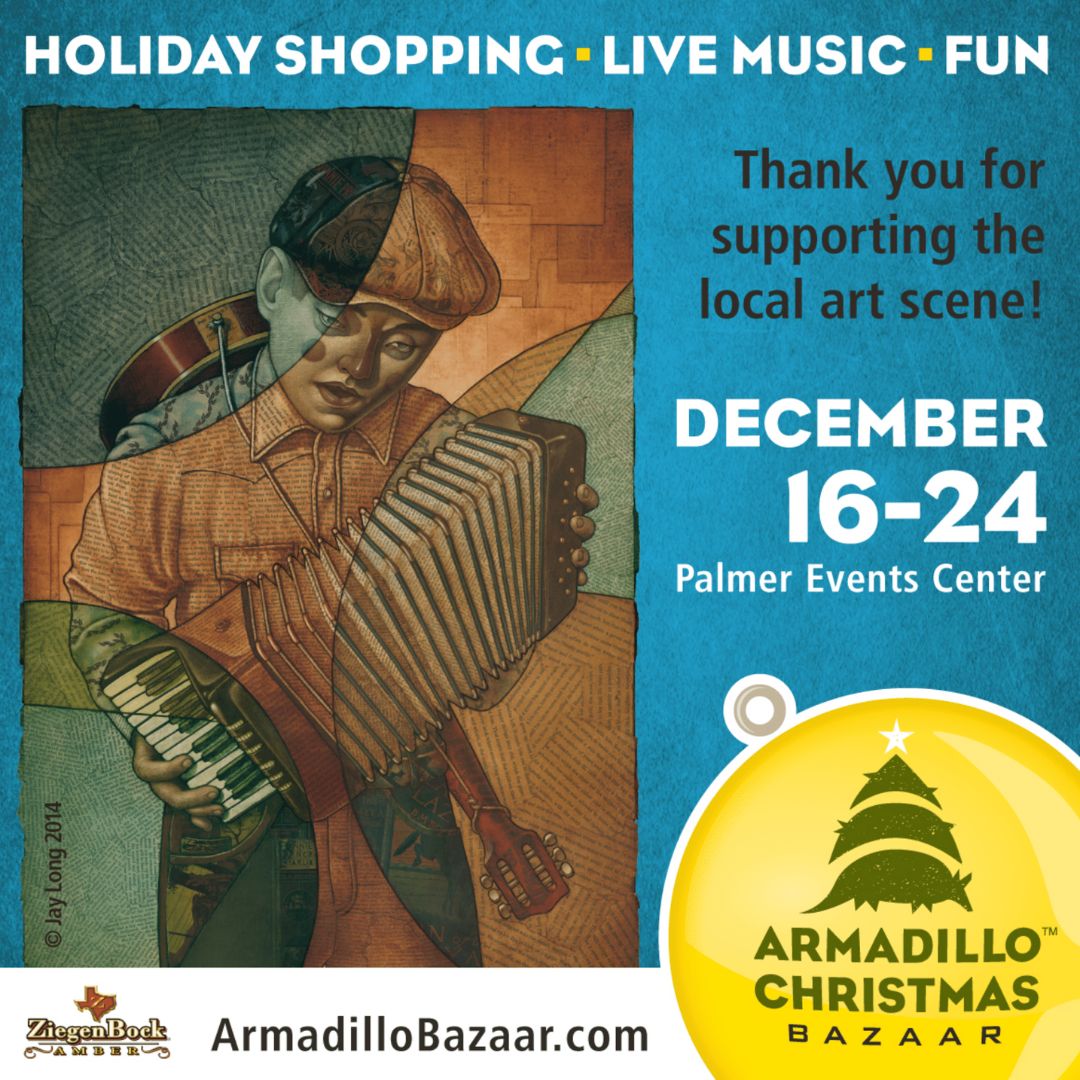 12 Days of Giving was created as a way to give back to the Austin community by supporting local nonprofits. With 12 days to shop, the Armadillo Bazaar selected 12 local organizations, each receiving a portion of proceeds from their designated day. The featured art for the year was designed by Chris Smith of Smith Map Studio. We welcomed a variety of exciting new artists to the show, including Rebekah Vinyard, Nathan and Jennifer Falter of Springfield Pottery, Kevin Tong, and Amanda Bennett—each bringing their own creative voice to the Bazaar’s diverse mix. The 2018 music lineup featured 37 acts, including 10 musicians making their Armadillo debut. Highlights included the modern R&B soul of rising star Mélat, a long-awaited return from Gary P. Nunn, writer of London Homesick Blues, the high-energy funk and swagger of Shinyribs, and a show-stopping performance from fiddle prodigy Warren Hood, a second-generation Armadillo performer. At its core, the Armadillo Christmas Bazaar remains the place to find heartfelt gifts in every price range, build your art collection year by year, meet artists in person, and even commission custom pieces.
