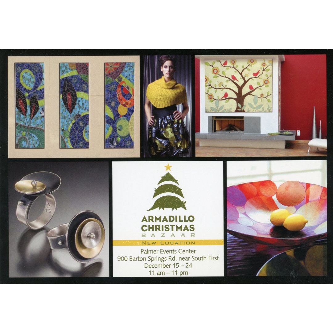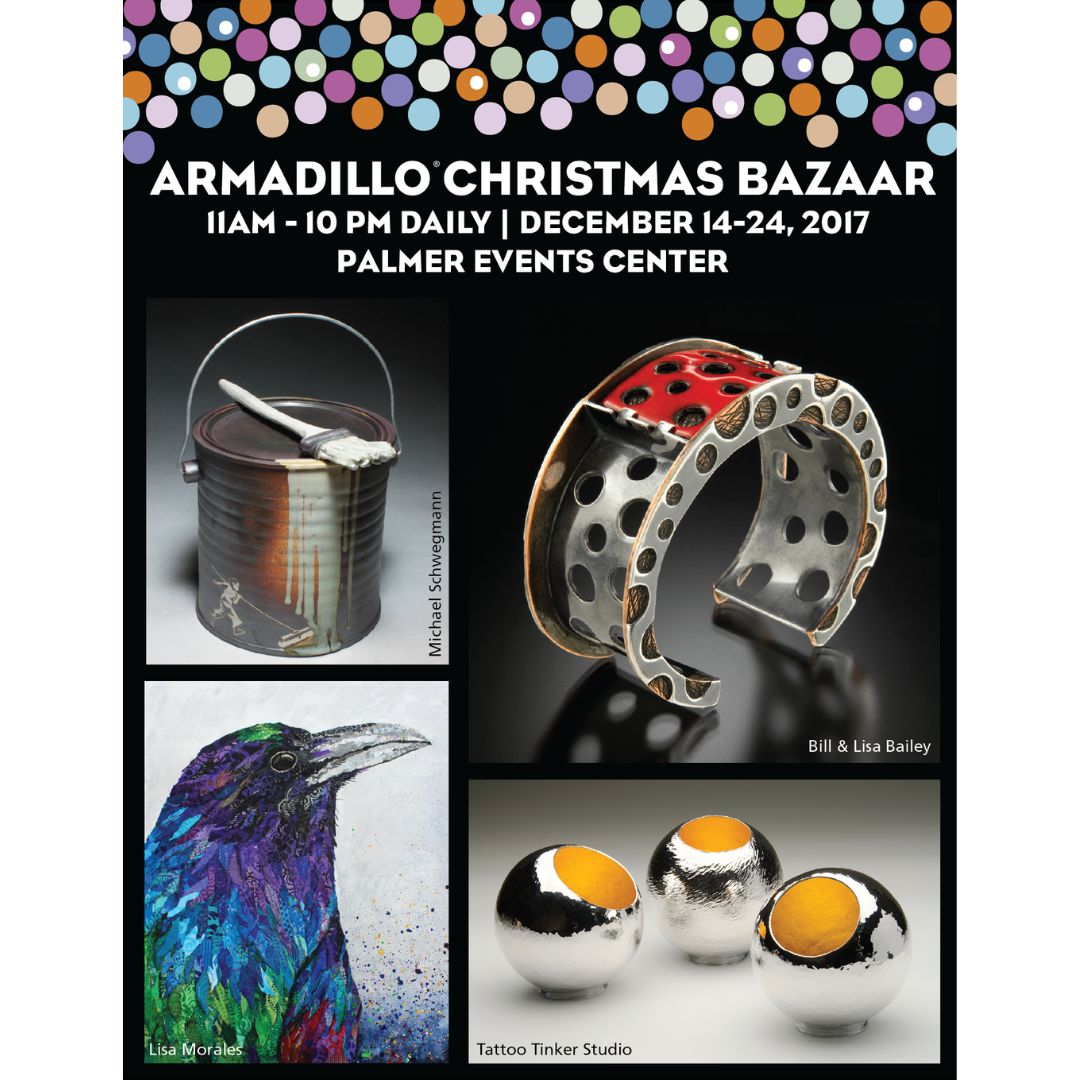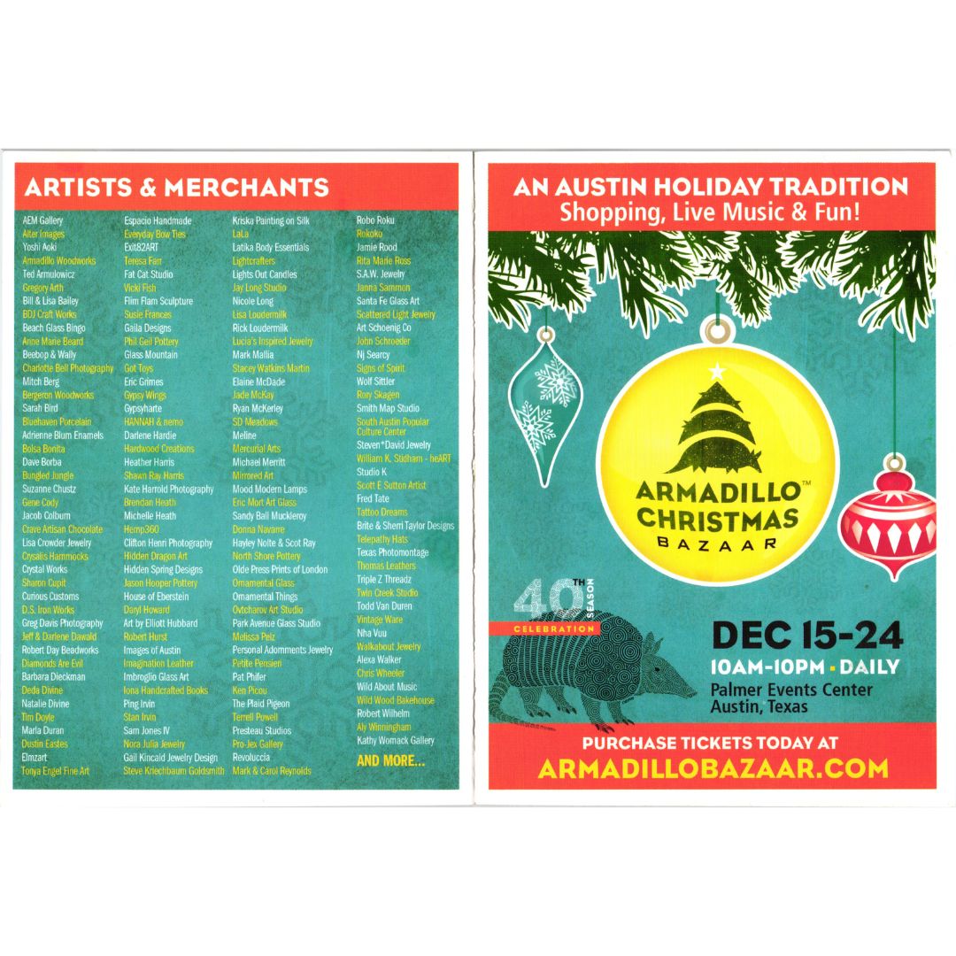Notable artists included Fred Tate Jewelry, Bill Bailey Jewelry, Sean & Helen Ashdown, and Robert Day Beadworks. Jim Franklin had a booth creating airbrushed portraits—and designed a poster of armadillos pulling Santa in a sleigh on the moon.