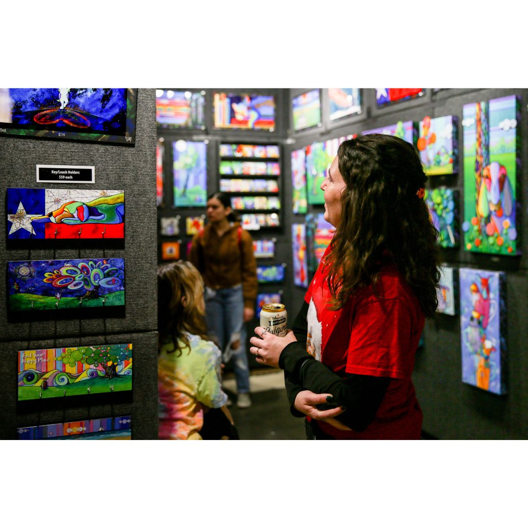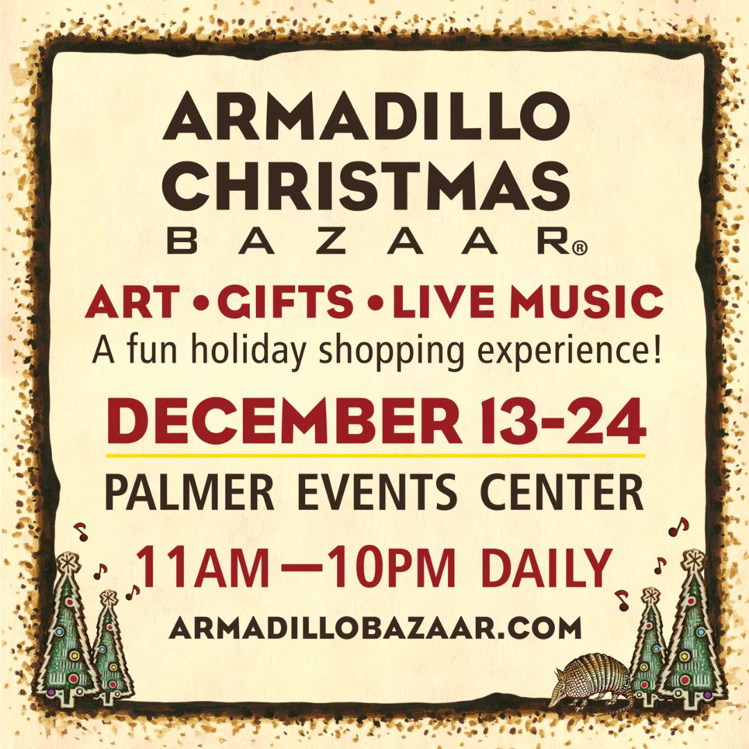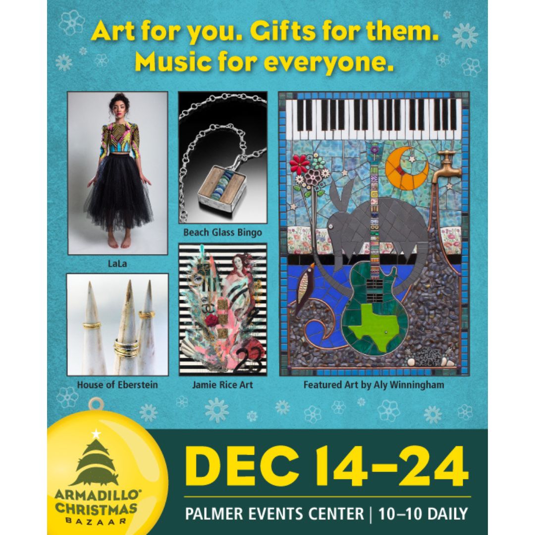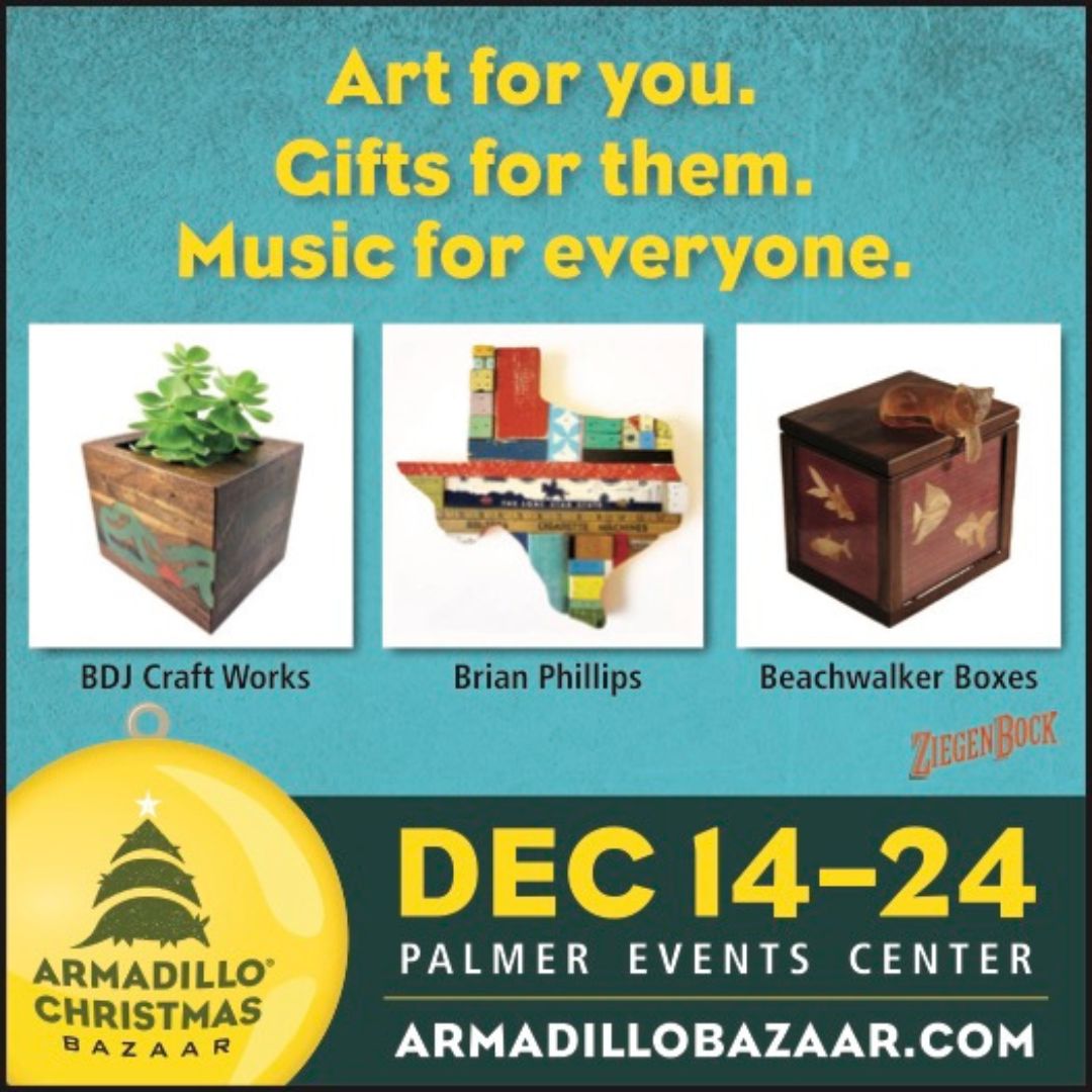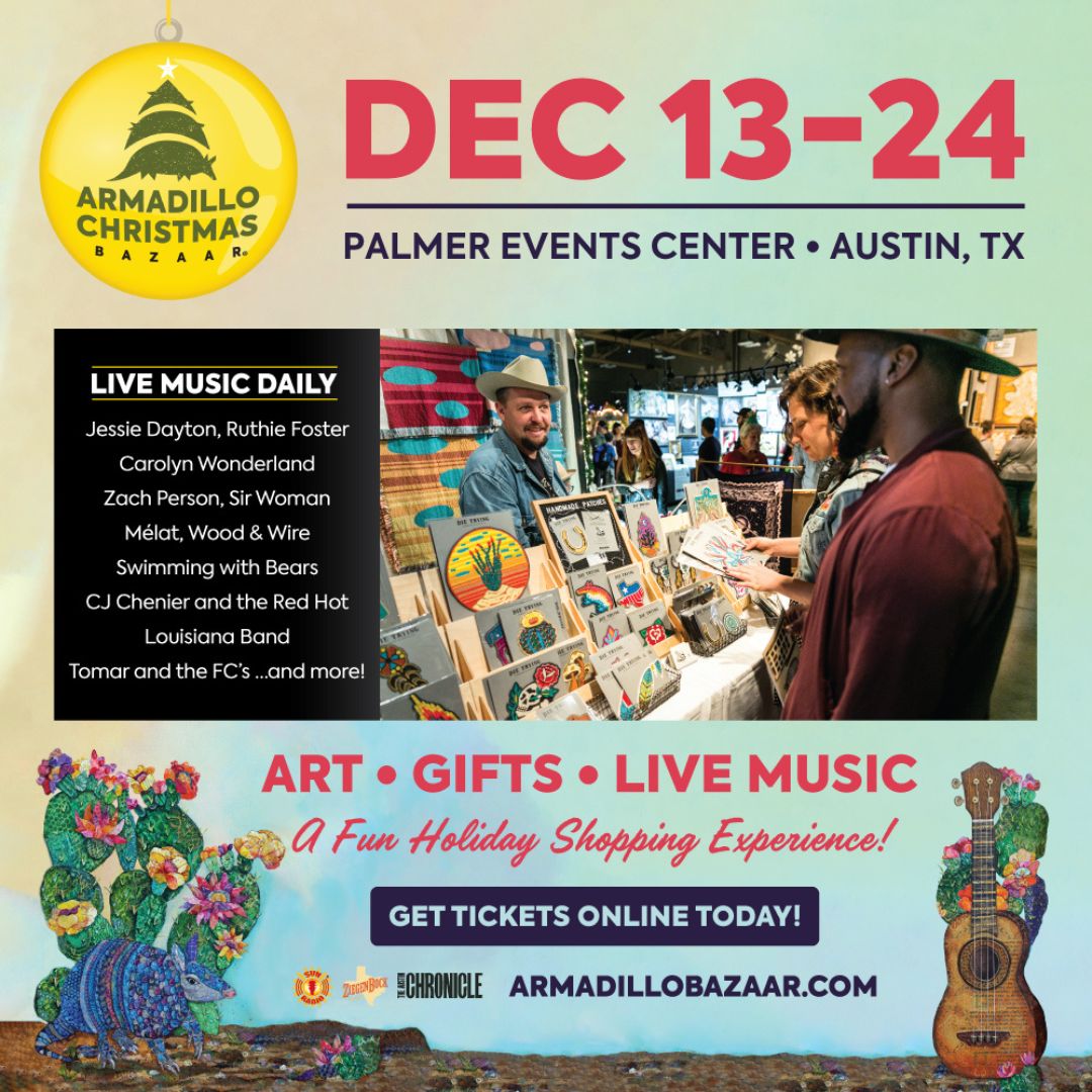 The Armadillo Christmas Bazaar continues to be the place to discover the art you love. With an unmatched mix of styles, mediums, and artists, you simply won’t find a more eclectic selection anywhere else. This year’s featured artwork was created by Robert Hurst, whose vibrant design captured the heart of the show. We also celebrated the season by showcasing love stories from artists and guests on our stage wall. Meanwhile, SUN Radio added a heartfelt touch by hosting a Message Tree, inviting visitors to write a note on a paper snowflake and hang it as part of a growing community display. We welcomed an exciting group of new artists this year, including beloved locals like Dan Grissom, Flip Solomon, and Rick Van Dyke, as well as talented makers from farther afield, such as Mick Whitcomb, Taylor Blaine, and Alan Potter. With 33 bands performing throughout the run, our stage was as lively as ever, featuring standout performances from Charlie Crockett, Redd Volkaert, and Emily Gimble. As Greg Davis says best: “You can’t really say you’re from Austin unless you’ve visited the Armadillo Christmas Bazaar.”
