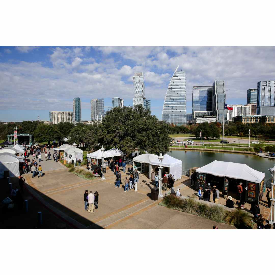 A new rendition of a holiday tradition outside on the grounds of the Palmer Events Center. In response to the global health crisis, we turned to our artists and asked, “What do you want to do?” Their answer was simple: “Let’s take it outside!” So that’s exactly what we did. Over the course of just three days, we experienced all the seasons—sunshine, wind, rain, even a touch of winter—but through it all, we had the best time celebrating art, music, and community with the City of Austin. This outdoor edition of the Armadillo Christmas Bazaar featured a beautifully curated selection of over 100 artist booths, including 30 first-time exhibitors, all showcasing their finest work. Set against the backdrop of the city skyline, the terrace provided the perfect setting for art lovers to connect with creativity in the open air. Live music brought even more magic to the experience, with two performances each day by an incredible lineup of talent: