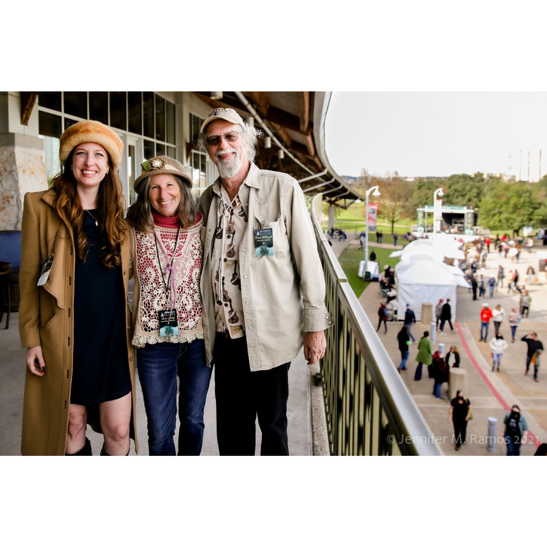 When it became clear that our old venue wouldn’t be ready in time, we found ourselves in a last-minute scramble to secure a new location. The City stepped in with a lifesaving suggestion: the Convention Center. At first glance, the space felt cold and industrial—more like the deck of an aircraft carrier than a festive gathering spot. But with creativity and heart, we transformed it. Lights danced on the walls, decorations brought warmth to every corner, and artist booths glowed with color and energy, turning the stark hall into a vibrant, inviting celebration. Leea Mechling brings the South Austin Museum of Popular Culture (now AUSPOP) into the show. Notable artists joining us Greg Davis Photography, Heather Harris, Yoshi Aoki, Sonia Sadler, David Melancon, EXIT82ART and Craig Timmerman. Some of the music highlights were a tribute to Steven Bruton by Malfred Milligan, Ian McLagen and Kat Edmonson. Capital Metro sponsored our stage and moved a Dillo bus into our show, called the Dillo Plaza.