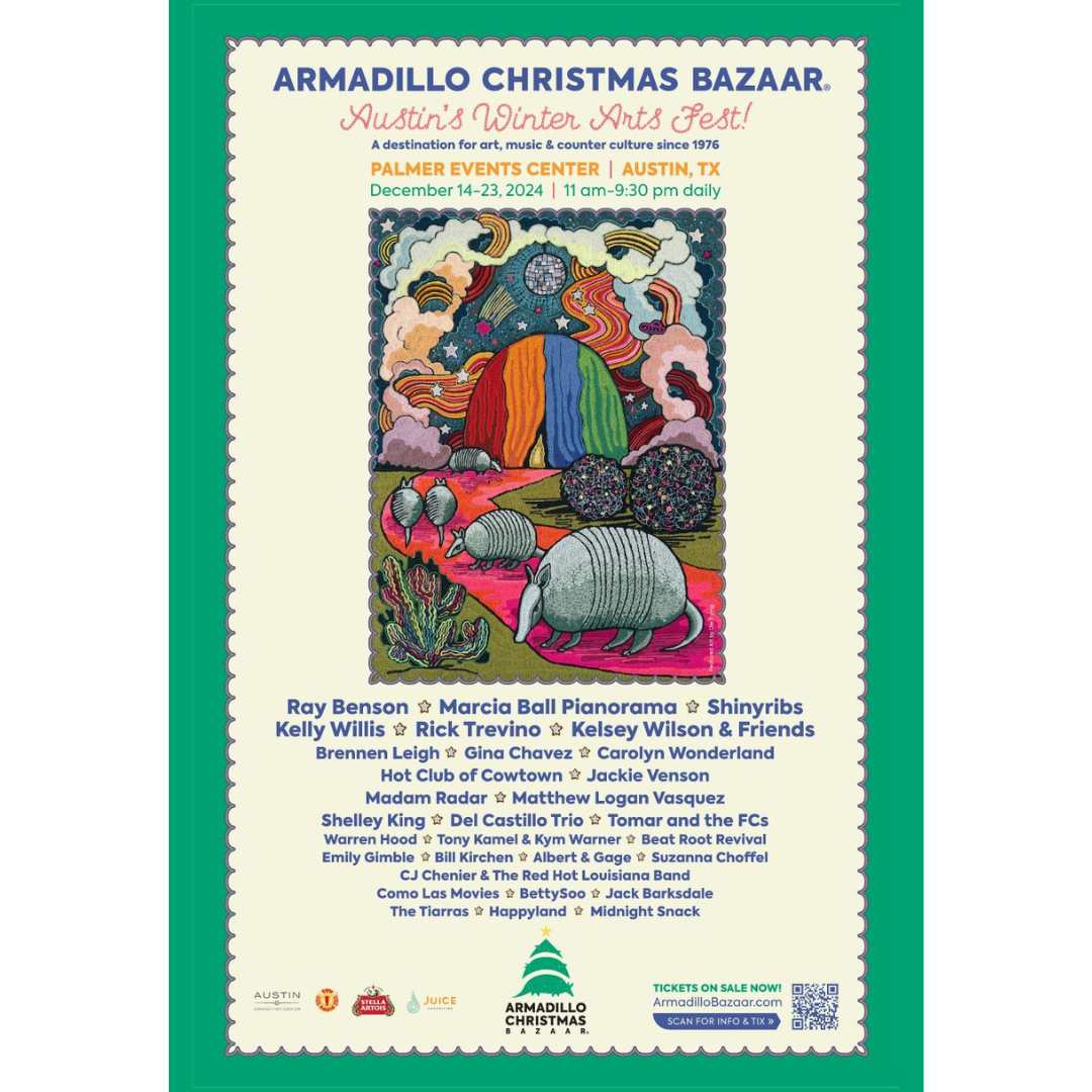 For decades, the Armadillo Christmas Bazaar has been a cornerstone of the holiday season in Austin—deeply rooted in the city’s rich history of counterculture and artistic evolution. It’s more than just shopping; it’s a one-of-a-kind experience that celebrates the true spirit of Austin’s art, music, and community. This year’s featured artwork came from Lacy Vancourt – Die Trying, whose chainstitched masterpiece depicted the Armadillo Bazaar in whimsical style: a parade of little dillos making their way to the big event under a magical, star-filled sky—set against a dreamy landscape of neon cacti and twinkle-light tumbleweeds. We welcomed an exciting lineup of new artists, including Melinda Risk, Carlos Montenaro – Rewind, Mike Wardynski, and Abigail Crow, adding fresh perspectives to our ever-evolving creative family. On the music front, the lineup was truly stellar. We were thrilled to bring back Rick Treviño, while also welcoming first-time Armadillo performers Brennen Leigh and The Tiarras, who lit up the stage with unforgettable sets.