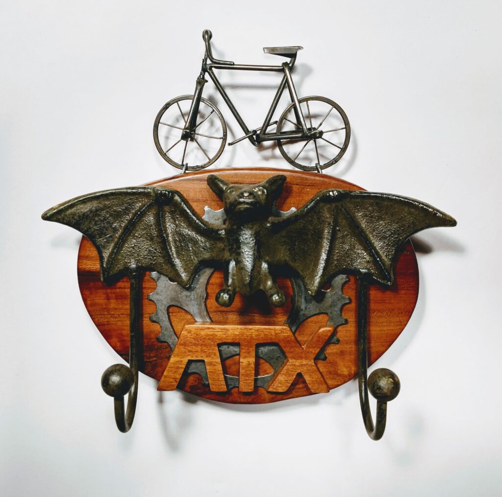 Ethan channeled his Austin pride roots when making this handmade solid bike and bat hook set.