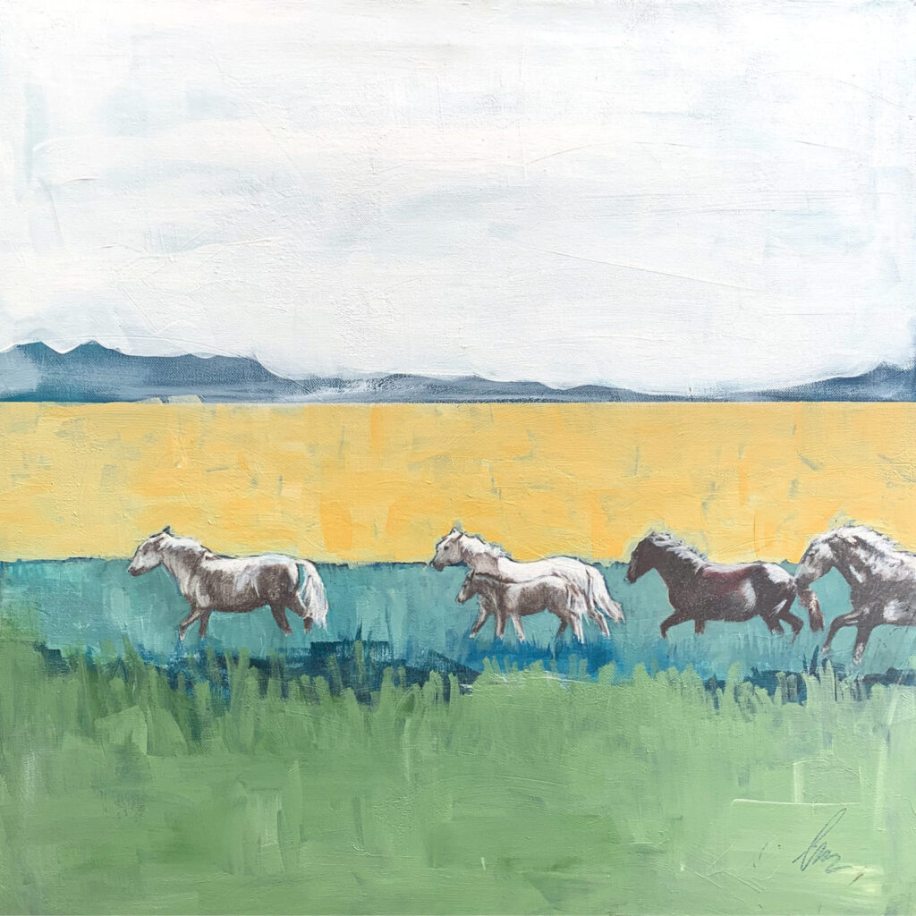 Mountain Run by Austin artist Rachel Dory reflects her signature style—capturing life along the American roadside. Using layered materials and a process of building up and scraping away, she reveals the essence of each place and moment.