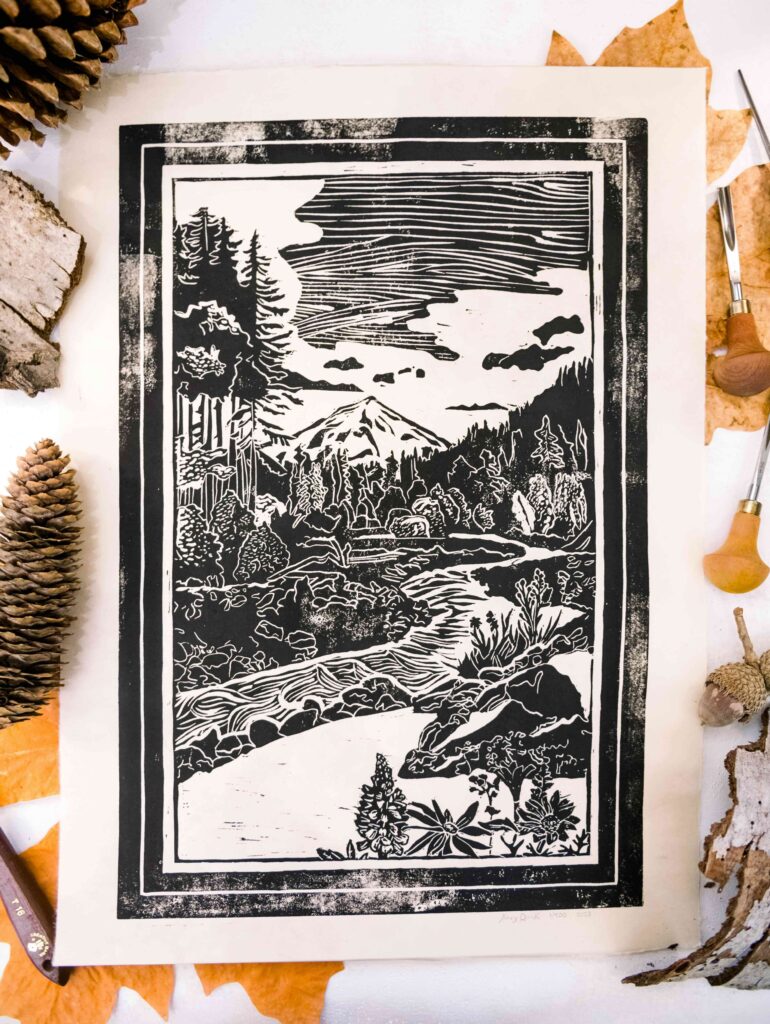 This detailed relief print began as an original sketch on a linoleum block, then hand-carved, inked, and individually hand-pulled using a lever-style press—each print a unique work of art.