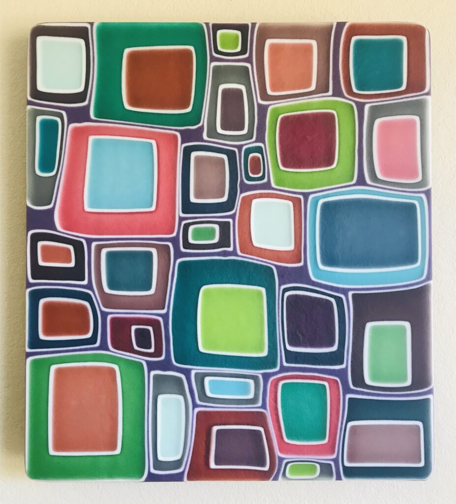 A modern art fused glass party dish with a retro flare, completely handcut and designed by Lindsay.