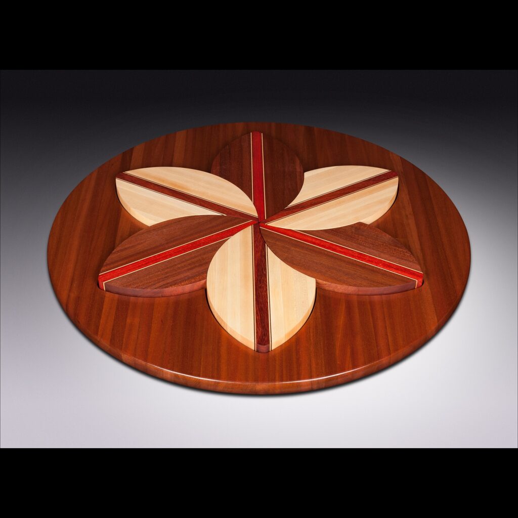 Bring beauty and ease to your table with this handcrafted Flower Lazy Susan. Made from laminated hardwoods like sapele, oak, and maple, its removable trivets let you create your own design—blending function, durability, and relaxed creativity.