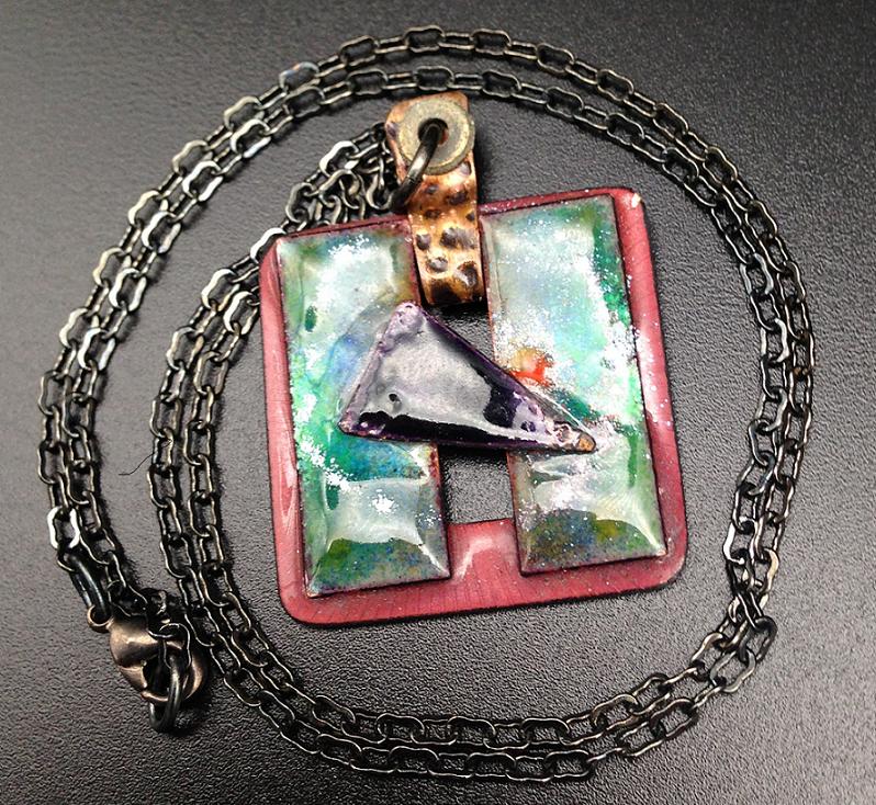 Inspired by jazz this is one in a series of fun geometric designs which also includes earrings. This necklace is torch layered and fused with color glass enamel on copper.