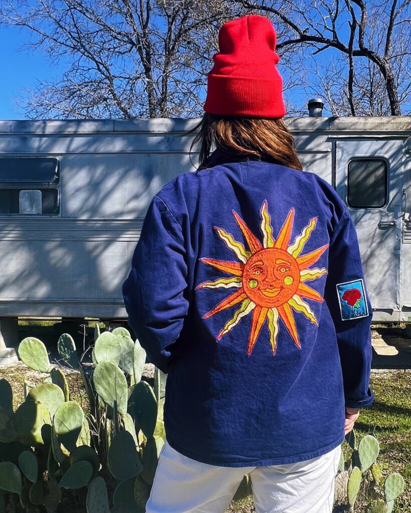 A one-of-a-kind vintage French blue chore coat, reimagined with bold chainstitch embroidery, curated vintage patches, and unique buttons. Features snap closures, wide sleeves, and classic chest and hip pockets—a timeless statement piece with effortless edge.