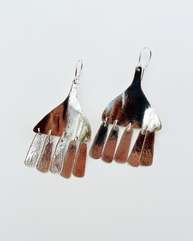 Dancing in the Dark earrings are hand cut, hammered and formed post earrings with hand cut and hammered tassels. These earrings are lightweight statement earrings with so much light catching movement.