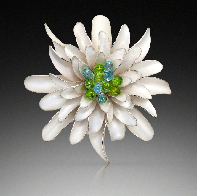 This stunning dahlia is hand-formed by Theresa using traditional hammering techniques, shaping thin metal sheets into strong yet delicate organic forms. Inspired by nature, she distills its elements into refined, geometric shapes.