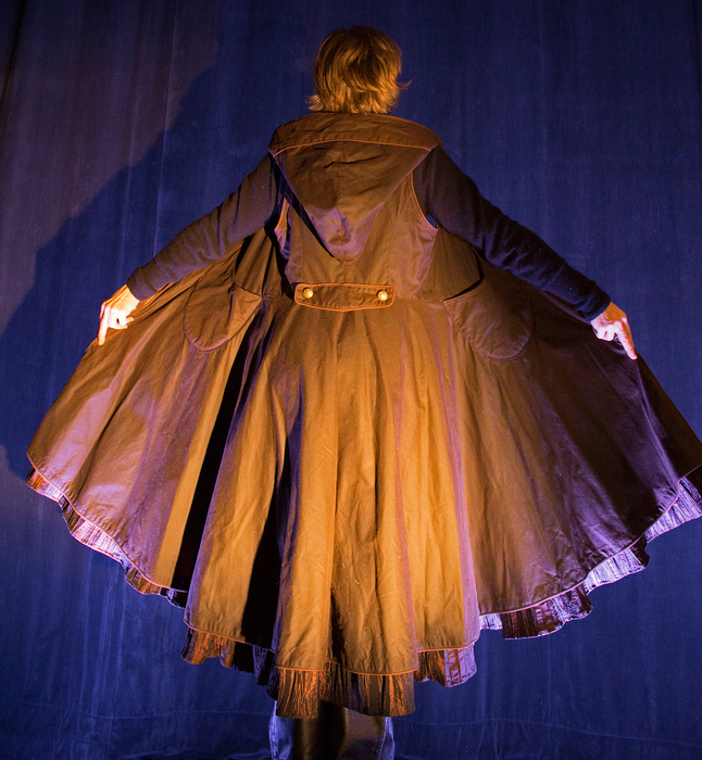 Ute designed, sewed, and sculpted this theatrical, period-inspired coat using a rich mix of leather, textiles, vintage trims, bohemian glass beads, found objects, and hardware. Each piece is a layered assemblage of color, texture, and form—wearable art with a story.