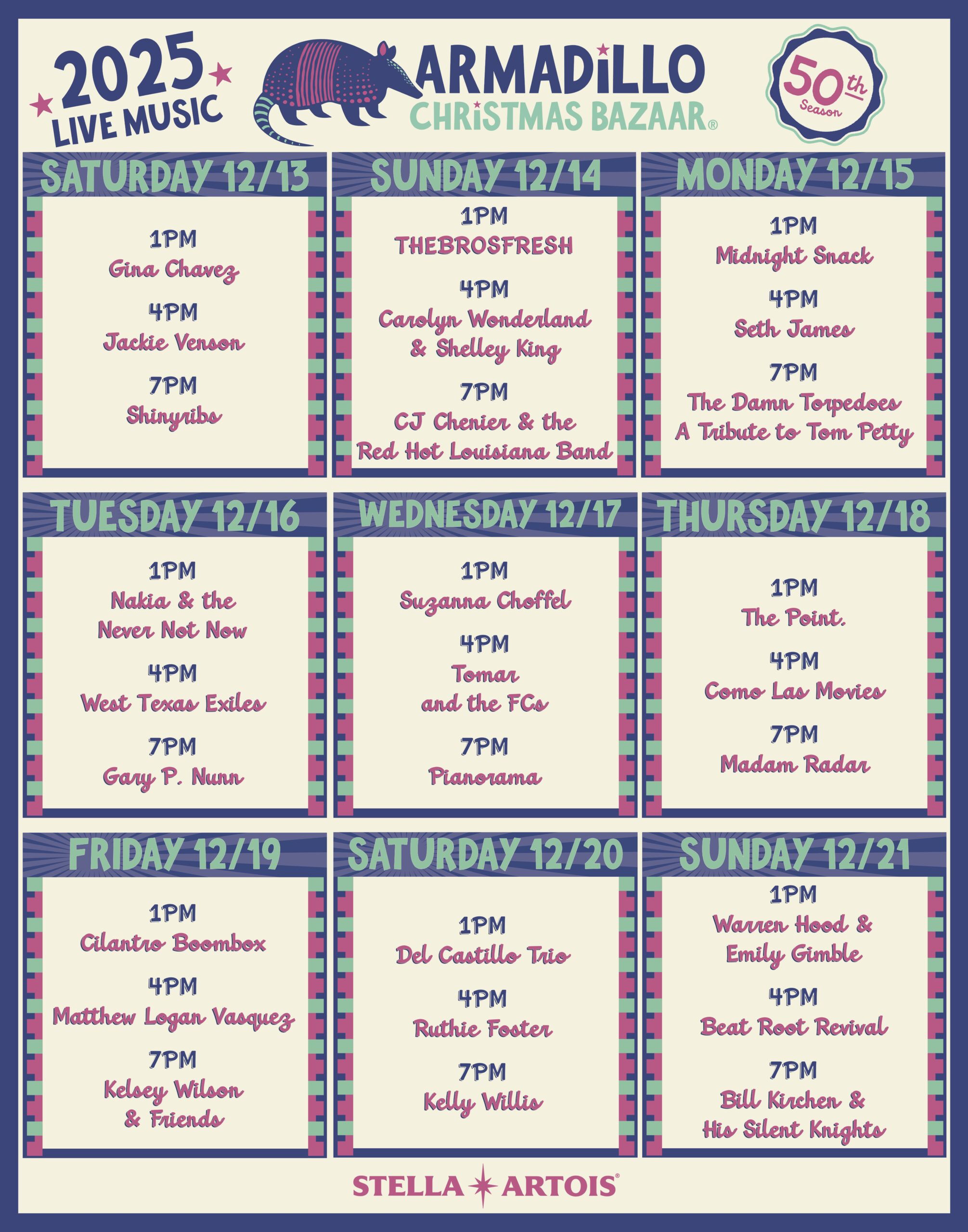 Our music lineup for the 2025 Armadillo Christmas Bazaar is fully booked.