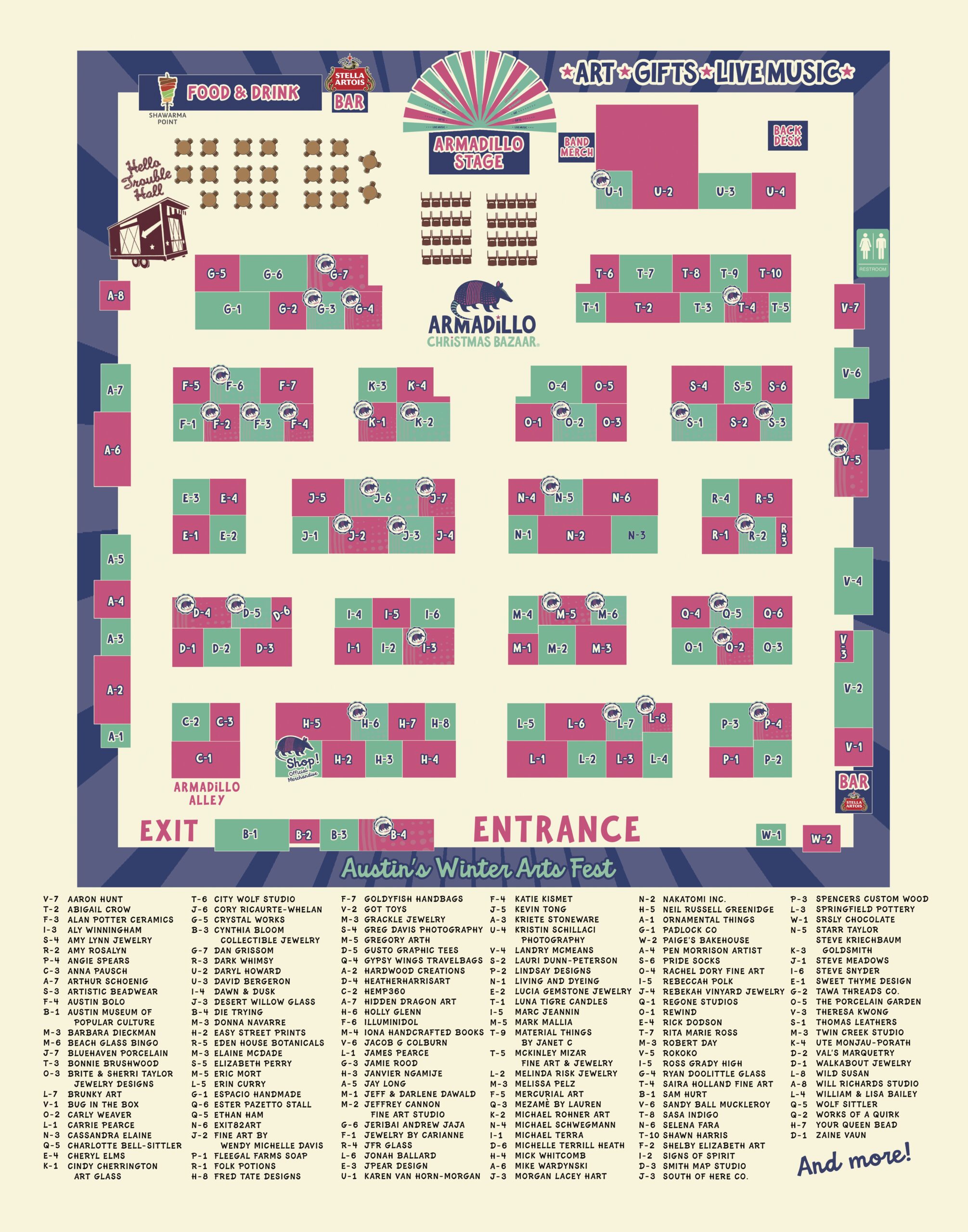 The Armadillo stage is mostly curated by invitation, led by our longtime talent booker, Nancy Coplin and the Armadillo Christmas Bazaar production team.